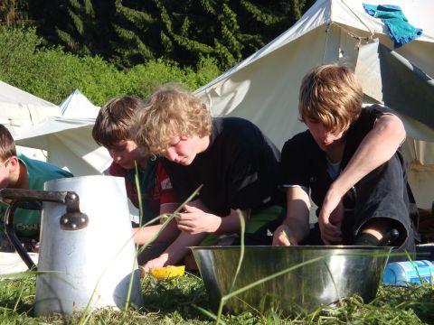 Hat man jedoch alles beisammen und fühlt sich gut gerüstet für’s Lager, so kommt es allzu oft vor, dass man nach einer Mahlzeit auch wieder dasteht wie der letzte Eumel.. und das deswegen, weil beim Spülen in der Regel 50% des Geschirrs in den unendlichen Tiefen des Sommerlager-Spülwassers verloren gehen oder jemand (wie oben beschrieben), der ohne Geschirr angereist ist, einen guten Fang im Spülbecken gemacht hat.. Ihr seht also, es ist nicht ganz einfach mit unserem Pfadfinder-Geschirrbeutel, aber ich hoffe, ich konnte ein bisschen Licht ins Dunkel bringen 😉